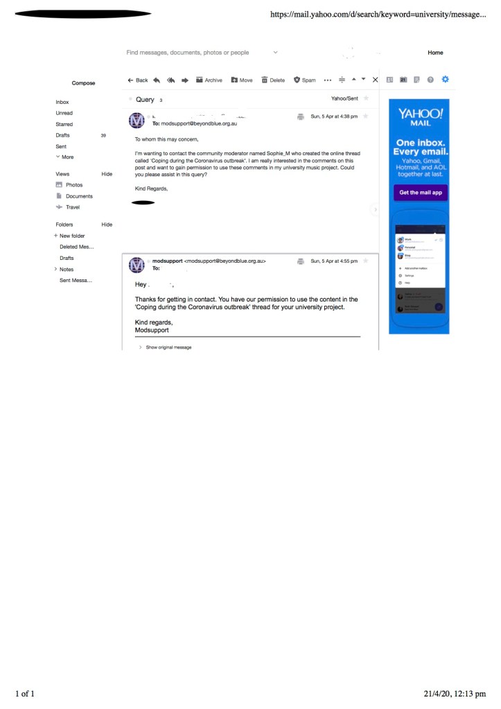 As someone new to the songwriting scene, I needed a little inspiration to help get me started. There are many legalities to the online world, so I wanted to gain permission from the Beyond Blue Committee before using other people’s comments in the creation of my song. I was so surprised that the committee emailed me back so quickly (as below). All was clear and I was ready to begin the process.