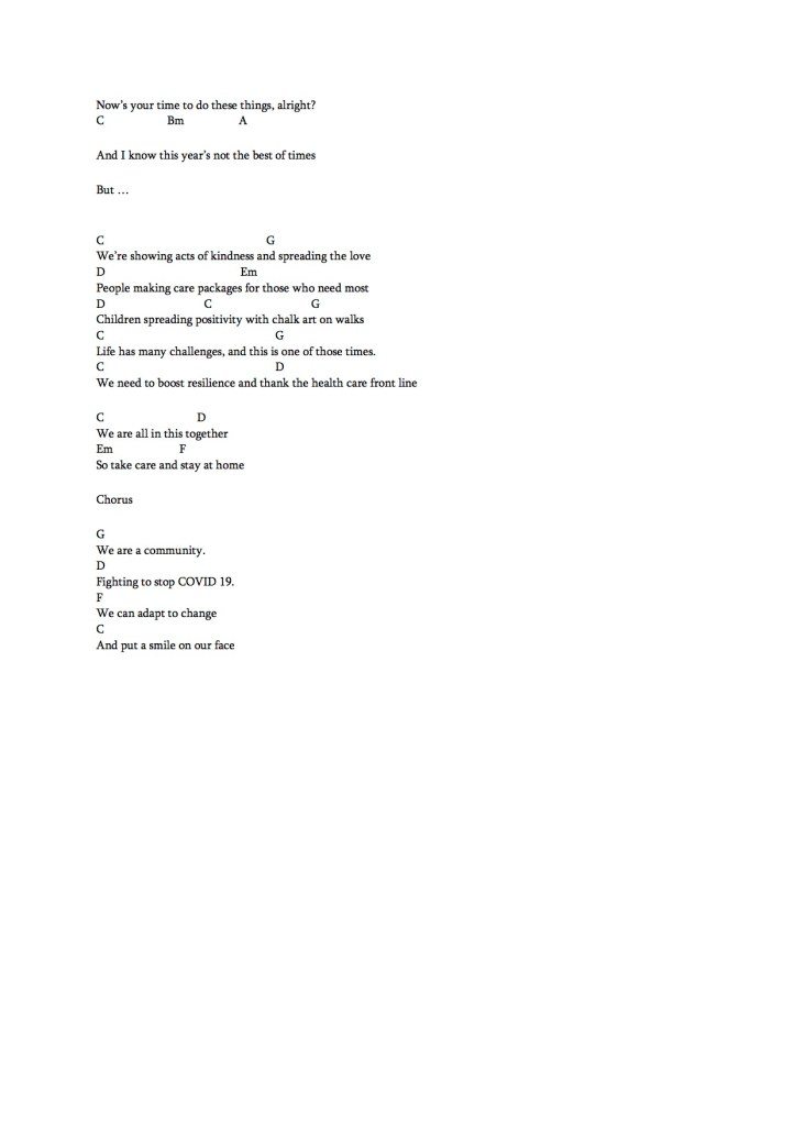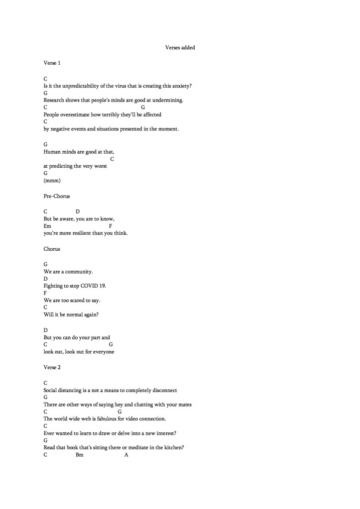 After writing my first chorus, I decided that first person perspective wasn’t relatable enough for a wider audience. Whilst we may not all be scientists, we are working together as a global community to do our part and reduce the transmission of this virus. The new chorus reflects this below: